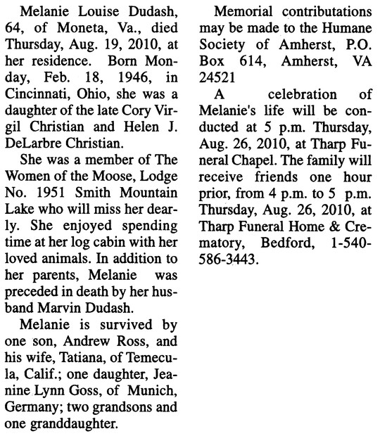 Mel & I had visited Melanie several times in Fla., her husb Marvin was a really super nice guy, & was a hay farmer. She had her horses & was into raising exotic birds, from the eggs. We would talk on the phone occasionaly, & she called when they moved to Virginia. We never did get there to see them, when Marvin died unexpedly she was so crushed. When I got the word Melanie past away I was so sorry we hadnt made it to her log house, she loved it so. Yes Mel & I had a lot of memories with Melanie. I remember when she came to the Bash, one of the very 1st, & our son, Jeff came down to tell us he was back from his vacation. Melanie was talking to us & we introduced him to her. Melanie pop up & said "and just think, I could have been your Mother." Jeff's look was priceless. Mel had been dating her before he & I started dating.