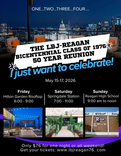 The LBJ-Reagan Bicentennial class of 1976 invites all classmates to attend our incredible 50 year reunion May 15-17, 2026. Over the last year, your reunion committee has been planning the most Far Out reunion we could imagine to Celebrate!