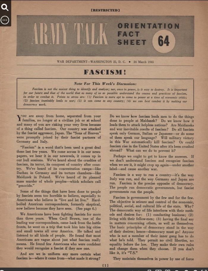 War Department, “Army Talk 64: FASCISM!” March 24, 1945, at https://archive.org/details/ArmyTalkOrientationFactSheet64-Fascism/mode/2up