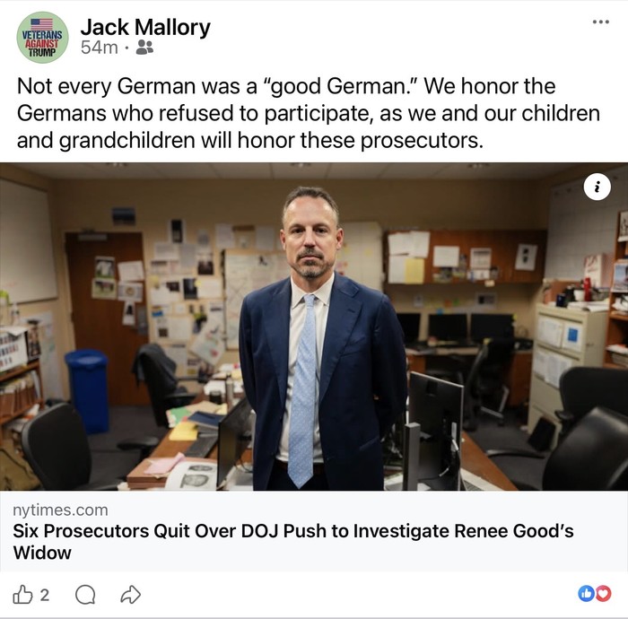 Heather Cox Richardson shows us how our government explained fascism to our military during WWII. Now, every day, our government provides examples. (https://open.substack.com/pub/heathercoxrichardson/p/january-9-2026?r=asnwm&utm_medium=ios&shareImageVariant=overlay)