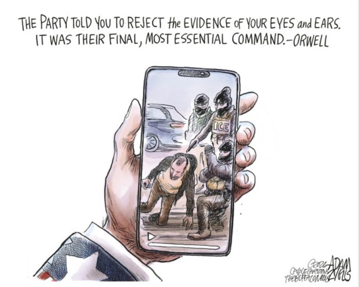"Glorification of violence. Every state uses violence to enforce its laws, but liberal states use it reluctantly, whereas fascism embraces and flaunts it. Trump thus praises a violent mob; endorses torture; muses fondly about punching, body-slamming, and shooting protesters and journalists; and reportedly suggests shooting protesters and migrants. His recruitment ads for ICE glamorize military-style raids of homes and neighborhoods; his propaganda takes childish delight in the killing of civilians; and we have all seen videos of agents dragging people out of cars and homes—partly because the government films them. Like the demolition of civic decency, the valorization of violence is not incidental to fascism; it is part and parcel.