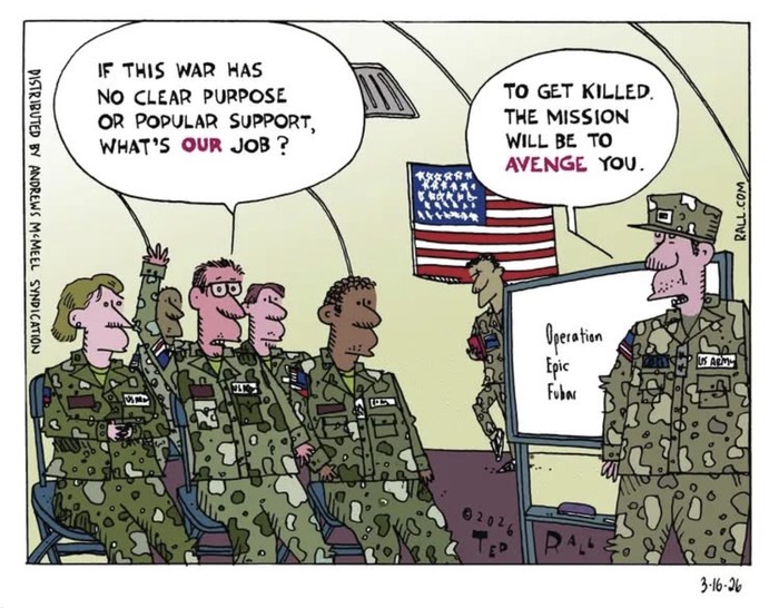 (Now Trump has done some bat-shit crazy things before and gotten away with it — imposing nonsensical and counterproductive tariffs, giving hundreds of billions of dollars in tax breaks to the rich while stealing health care from 16 million million Americans and pushing the economy closer to recession, shooting and killing American citizens protesting ICE tactics and his immigration policies, just to name a few — but the war in Iran exposes Donald Trump for his gross incompetence and stupidity in a way the world has never seen before. When asked yesterday when the war would end, Trump responded, “When I feel it in my bones.”