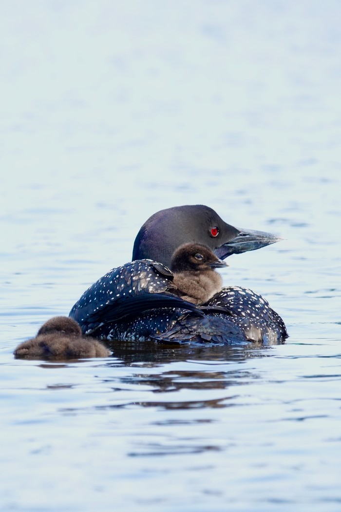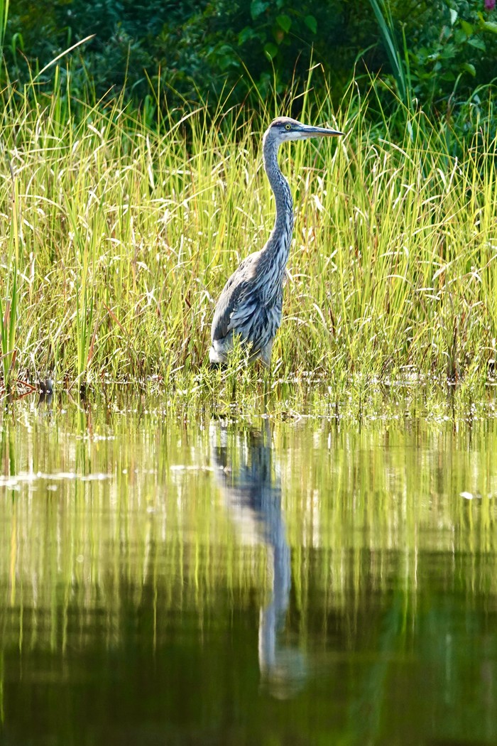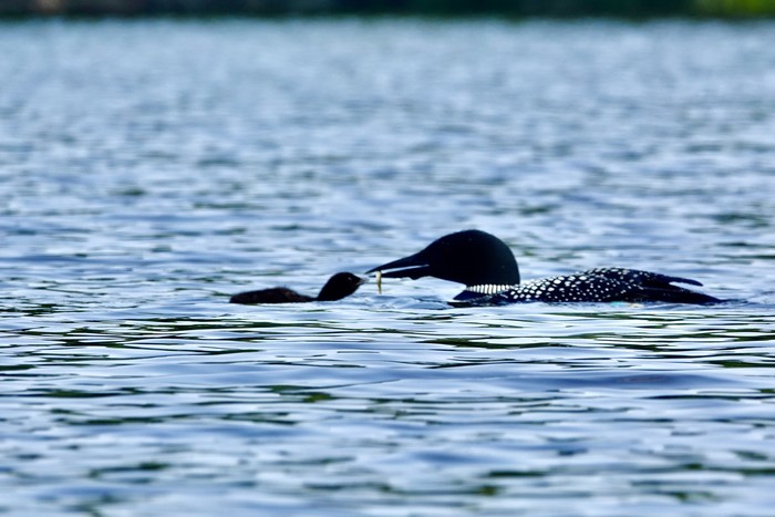 Another couple from the paddle. Baby loon getting fed, young heron. That heron is adult sized. Grew that big, hatching from a 2-3" long egg to about four feet tall, in three months or so! Now fledged, on its own. And we think our kids grow up fast.