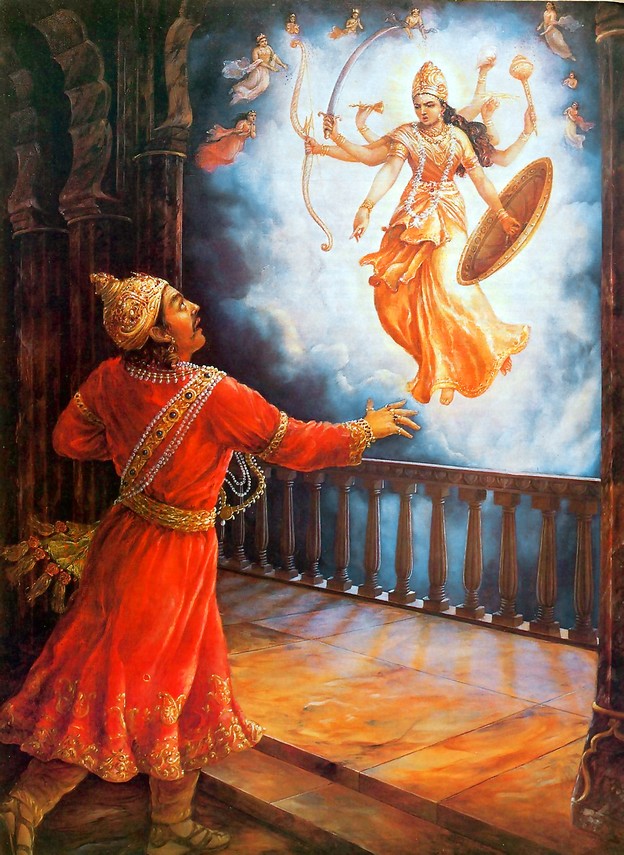 Pūtanā made herself appear very beautiful, with broad hips, thin waist, full breasts, earrings, and flowers in her hair. Entering the village of Vṛndāvan, she glanced about with a smiling face, and the residents and innocent cowherd women saw her as a goddess of fortune carrying a lotus flower in her hand.