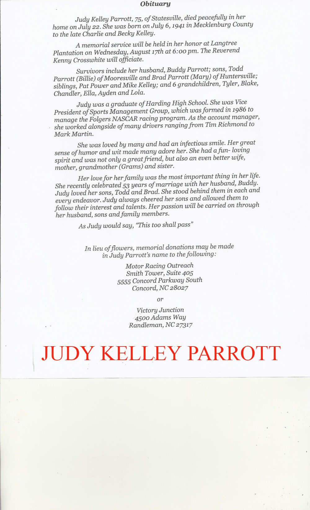 In lieu of flowers, please make donations to The American Cancer Society , 500 E. Morehead St, Suite 211, Charlotte, NC 28202.