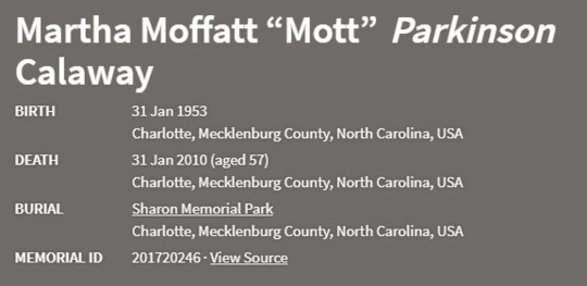 As published in Charlotte Observer, The (NC) - Wednesday, February 3, 2010 https://www.findagrave.com/memorial/201720246/martha-moffatt-calaway