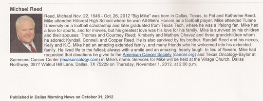 Adios compadre. You me and Sandy Staley at McMurry College in Abiline, playing football. You were big - you were strong-you had natural ability - but you couldn't get mad. Only Sandy could get you mad. We had good times: Sneaking Sandy into the drive in the trunk and driving through a plowed field with Sandy floating around back there with the loose spare and jack. Driving to Lubbock so I could see Carla and she would set you up with a blind date. Big Mike, A true "Gentle Giant". We' ll be seeing you.