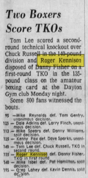 I found an old newspaper article where Roger had won an amature boxing bout. If you remember Tom Lee (class of 73) he won a bout that same day.