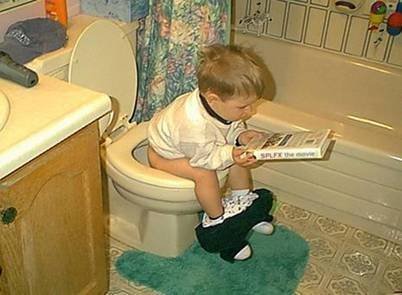 A little three year old boy is sitting on the toilet. His mother thinks he has been in there too long, so she goes in to see what's up.