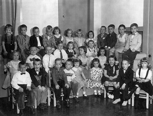 Young Folks' Kindergarten graduation photo in May 1958. The kindergarten was in the Methodist Church in the Center. Front row: Dennis Plante, Jarl Weyant, Bruce Lindwall, Scott Moore, Gail Taylor, Carol DuBois, Judith Bliss, Malcolm White, Leslie Bergeron. Row 2: Patricia Hendrick, Bruce Moore, Paul Stilphen, Brian Falk, Diane Tower, Deborah Hanson, Susan Wolcott, Christine Bortle. Row 3: Linda Bates, Peter Ouellette, Allan Phillips, Clark Swanson, Janet Betterley, Donna Anderson, Linda Mottle, Jeanne Symmes, William Kenyon, David Gallerani, Joan Stack, Stephen St. Marie. Photo courtesy of Mary Darling Studio.