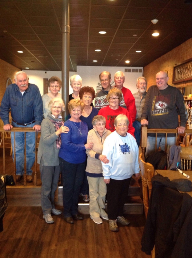 Members meeting for our first monthly class lunch, Jan.2020. Back: David Nuebel, Mary James, Sally Morton, Jack Dorsett, Jack Moore, Gabe Martinez, Ron Holvey. Middle: Sharon Strunk, Jan Moore. Front: Nancy Hays, Betty Oiler, Linda Sheets, & Sharon Brotherton.