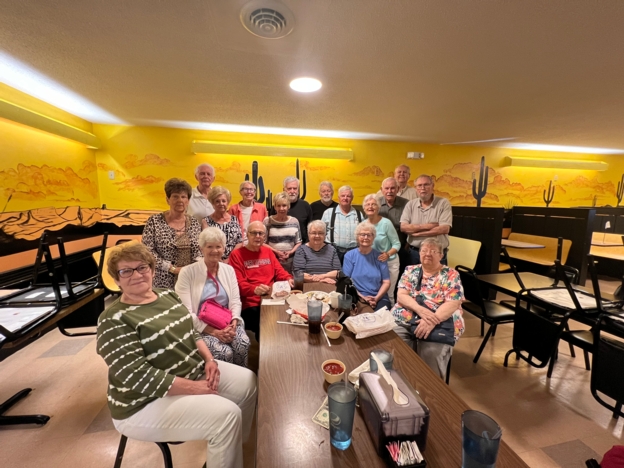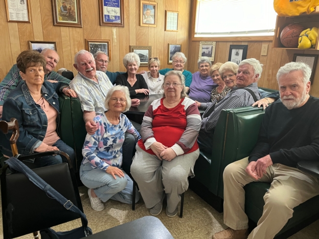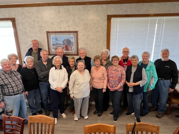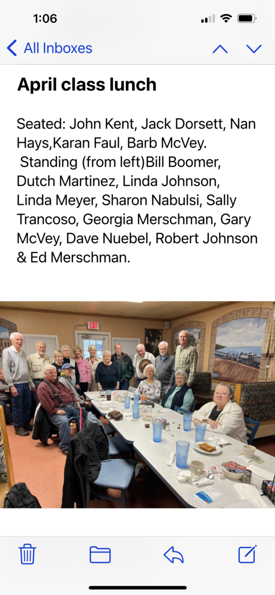 Class of 1961 March Luncheon: Front Row: L- R John Kent, Georgia Merschman, Nan Hays, Barbara McVey, Betty Oiler, Jan Moore, Karan Faul, 2nd Row: Sharon Scholl-Nabulsi, Gary McVey, Linda Johnson, 3rd Row: Ed Merschman, Dave Neubel, Robert Johnson, Sally Trancoso, Jack Moore, Linda Meyer, Dutch Martinez.