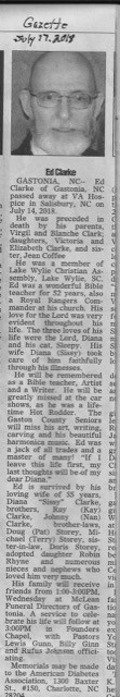 GASTONIA, NC--Ed Clarke of Gastonia, NC passed away at VA Hospice in Salisbury, NC on July 14, 2018.
