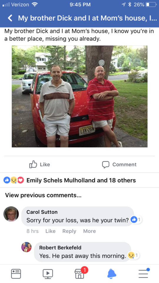 Although many in our class knew the Berkefeld twins, I was closer to Dickie for some reason. So sorry for your loss Bob. I can't imagine losing your twin and am sending prayers your way Bob. Know that there are many who loved Dick.