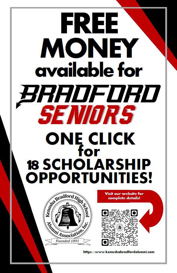 10/20/24 ~ If you have grandchildren, family members, or know students who are currently seniors at Bradford, there are nineteen scholarships currently available to them. Nineteen! All for $1,000 or more! Please see poster below for details and have them apply online at http://www.kenoshabradfordalumni.com or scan the QR code: