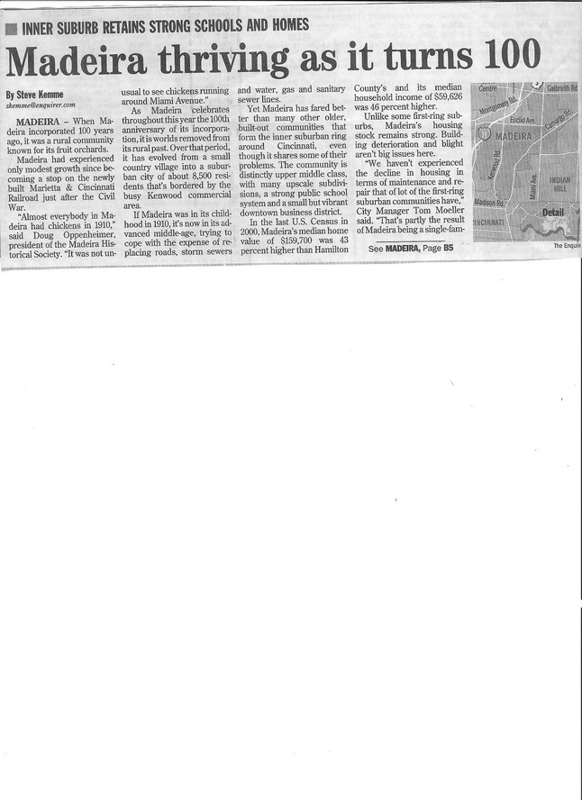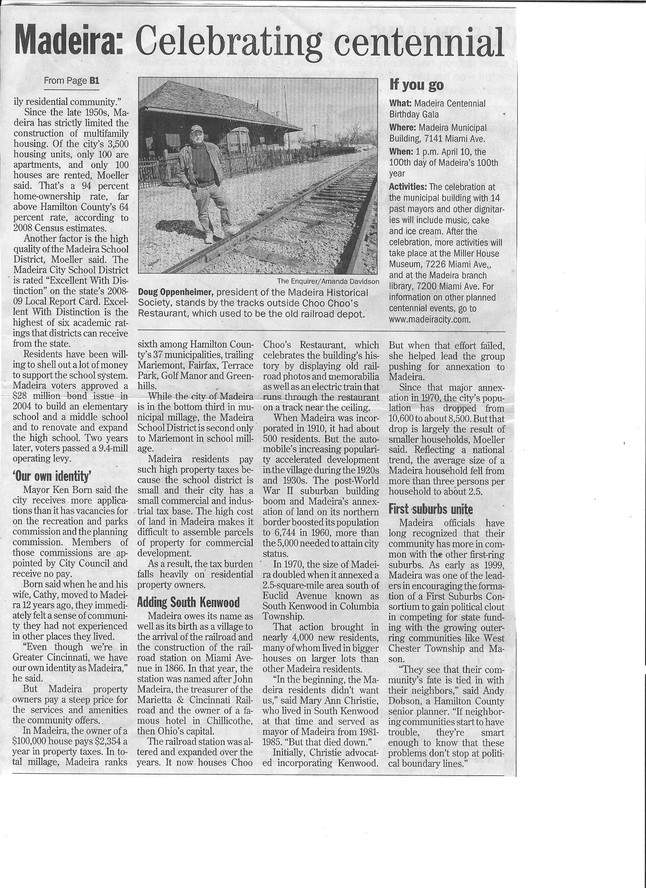 Article on the City of Madeira Centennial Celebration this year. Scroll down to see entire article.
