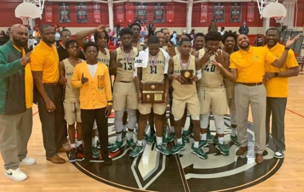 BTW’s Warriors overcame a slow start to the season and won its district championship with a below .500 record. Pictured (l-r): Asst. coach Charles Griffin, asst. coach Vic Lightning, asst. coach Tyrus Underwood, La’Travious Thomas, Alex Morgan, James White, Mariel Bolden, Abdoul Sacko, Jamar Frazier (center) Ethan Spencer, Tavion Ray (tourney MVP), Tayshaun Dye, Derrick Todd, Earron Bonds, Fontavin Swindle, asst. coach Reginald Huley, Jr, and head coach Antonio Harris. (Photo: Reginald Huley Jr.)