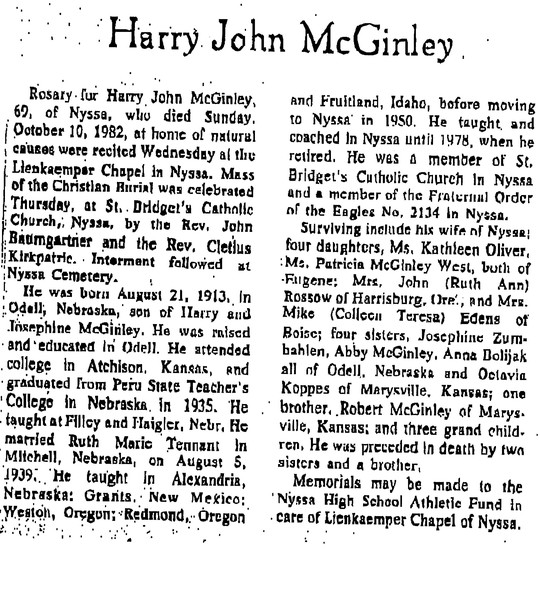 Harry McGinley was a nice caring man who I respected. Yes I did receive the flying eraser in Geometry class while talking with Patsy Waite instead of listening and paying attention to the lesson. Harry knew alot about athletics and he helped me in my own athletic career. It seems like yesterday when I sat and watched football with him while waiting for Ruth Ann.