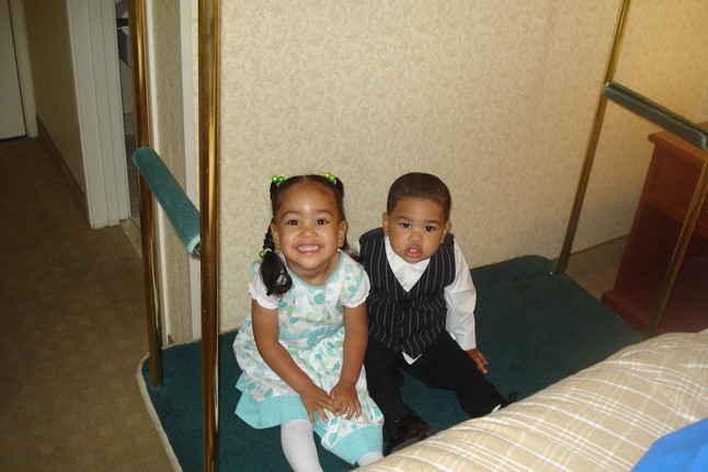 Pic of my daughter Imari Karice Riley 3yrs old and my son Malachi James Riley 2 yrs old, this pic is at our Hotel in San Francisco on our way out to go to church