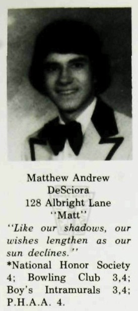 DeSciora, Matthew, 65, of Township Of Washington, NJ, passed away peacefully on March 6th, 2024. Beloved husband of Annette. Devoted father of Matthew and Catherine. Son of Andrew and Helen DeSciora. Dear brother of Ronald, AnnMarie, and Andrea. Loving brother in-law to Evelyn and John DeMartini. Son in-law to to Frances DeMartini. Caring uncle to Heather, Alexis, Andrew, Erica and Jason Possumato. Pop Pop to kitty cats Dakota, Dusty, and Bubba.