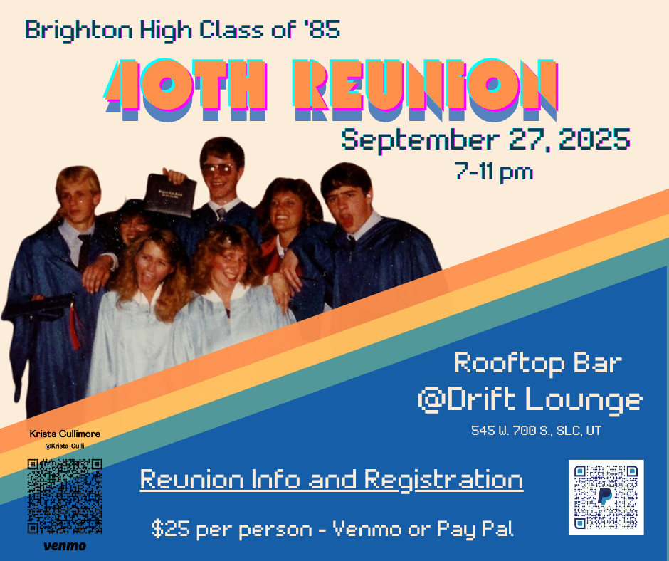 The reunion will be held at Drift Lounge. It is part of Woodbine Food Hall on 545 W. 700 S. in Salt Lake City. We have exclusive access to the Rooftop area,