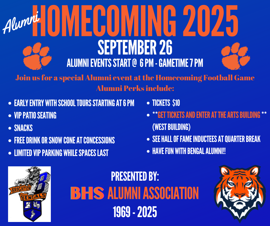 September 26, 6:00 pm - All Alumni event at the Homecoming Football Game - Click the link for the details. Cost will be $10 payable at the door. Cash or Credit Card