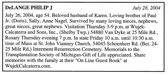 Detroit Free Press (MI) - July 28, 2004 Deceased Name: DeLANGE PHILIP J July 26, 2004, age 54. Beloved husband of Karen. Loving brother of Paul Jr. (Doris), Sally, Anne Nagel. Survived by many loving nieces, nephews, great nieces, great nephews. Visitation Thursday 3-9 p.m. at Wujek-Calcaterra and Sons, Inc., (Shelby Twp.) 54880 Van Dyke at 25 Mile Rd., Rosary Thursday evening 7 p.m. In state Friday 10 a.m. until 10:30 a.m. time of Mass at St. John Vianney Church, 54045 Schoenherr Rd. (Bet. 24-25 Mile Rd.) Interment Resurrection Cemetery. Memorials to the Transplantation Society of Michigan-Gift of Life appreciated. Share memories with the family at their "On Line Guest Book" at WujekCalcaterra.com.