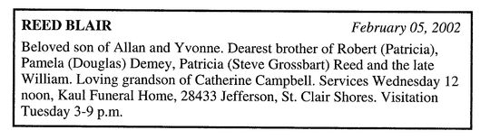Blair was a friend of mine until his death. I am still mad at him that he didn't ask for help and that I let my phone messages go unanswered, I know that Blair blamed himself for his brother Billy's death. Blair had artistic talent and I and many of his friends have works of his which are treasured. This last week (Feb.2nd) marked his passing. Many times his friends meet and go to a place in which his art is shown as a rememberance. If ever you are at H. Ford W.Bloomfield,go downstairs and see his glass partition. You can tell people that you knew the artist and maybe share a few thoughts with them. This will bring Blair back for just a moments and somewhere, somehow Blair will know