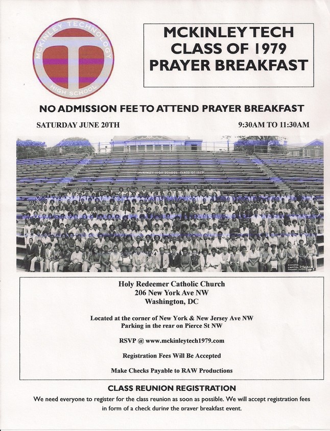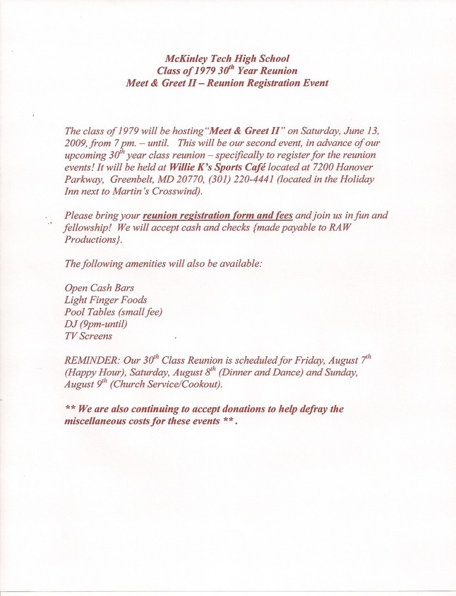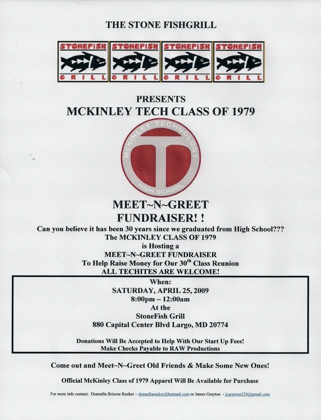 On February 12, 2009, Donnella Briscoe Rucker emailed alumni of the McKinley Tech Class of 1979 to initiate planning for the 30th reunion. The first planning meeting was held on Saturday, February 28, 2009 in New Carrolton, MD and was attended by thirteen people. Everyone became acquainted with each other and discussed how it was hard to believe 30 years had passed since high school graduation. They also discussed how great they looked even though they were fast approaching the age of 50. After the small talk was finished, the group got down to business. It was decided the reunion would take place the 2nd weekend in August and would consist of three events: Happy Hour, Dinner/Dance and Church Service/Picnic. The Reunion Planning Committee was established and the hard work began.