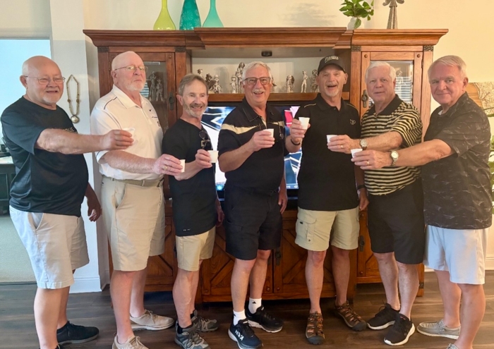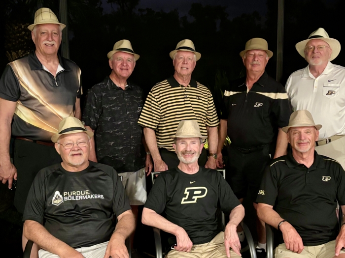 We are relieved to report that no confirmed reports of public disorder were submitted to local authorities due to fits of laughter resulting from college era stories that are embellished with each telling. John Prewett (Fall 1969), Larry Washmuth (Fall 1968), Dave Haney (Fall 1969), Dale Huddleston (Fall 1970), Bill Siewert (Fall 1970), and John Huseman (Fall 1970) gathered in Florida in early January to enjoy their friendship and watch the Boilers embarrass #8 Michigan State.
