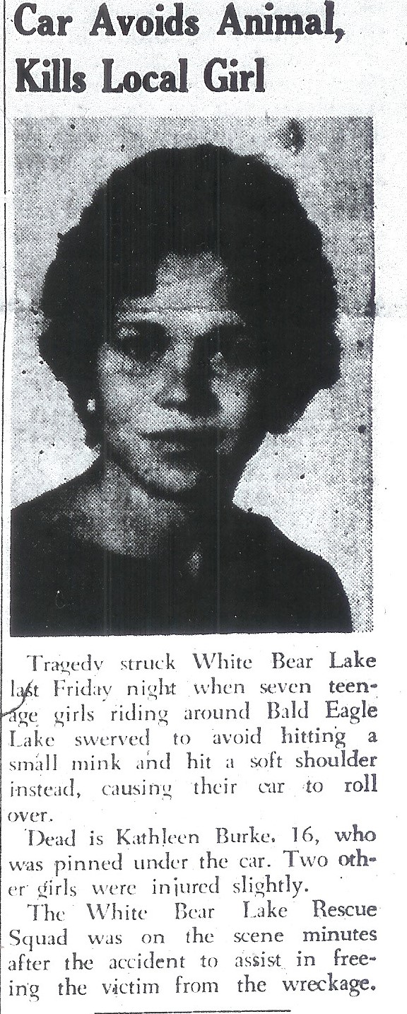 BURKE--Kathleen Mary, age 16, of 2579 Stacker blvd., White Bear Lake, accidentally November 16. Survived by parents, Mr. and Mrs. Ward Burke; 1 sister, Janet; 3 brothers, Lawrence, Timothy and Jerome, all of White Bear Lake. Funeral from The Lake Mortuary, 1107 3d st, at Bald Eagle ave., White Bear Lake, 8;30 a, m, Monday. Requiem Mass St. Pius X Catholic church, 9 a. m. Visitation after 2 p. m. Sunday. Parish rosary 8 p. m. Sunday. Interment Resurrection.